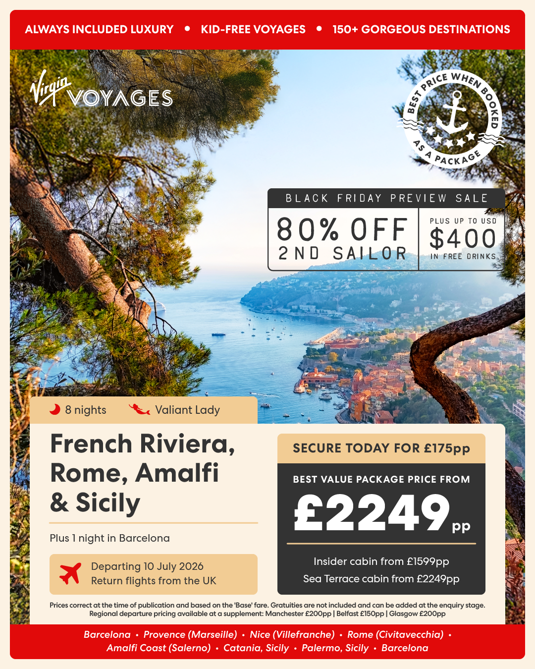 Some terms for this offer – available for bookings made after 7th July 2025 and goes until further notice. Please inform of booking bonus at time of booking. Bonus Loot (onboard credit) will be applied within 30 days of sailing – cancelled bookings will result in removal of bonuses.